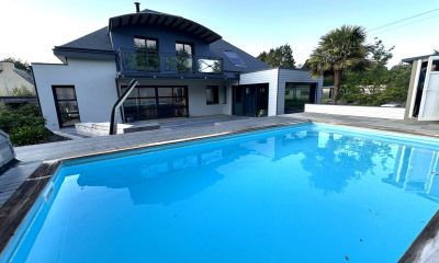Cette belle contemporaine de plus de 400 m² séduit par ses volumes et ses prestations haut de gamme. Cinq chambres d'hôtes spacieuses, deux gîtes indépendants composent cet ensemble implanté sur plus de 2000 m² de terrain. Idéale pour une grande propriété familiale ou pour une reprise de l'activité chambres d'hôtes et gîtes, elle est située entre mer et campagne, à quelques minutes d'Auray et du Golfe du Morbihan. Descriptif : L'entrée principale dessert les différentes ailes de cette propriété, parfaitement entretenue. La première est dédiée à quatre chambres d'hôtes avec salle de bain balnéo ou salles d'eau, toutes décorées et aménagées avec des matériaux haut de gamme. Intimité et tranquillité sont garanties dans cette première aile haut de gamme, également pourvue d'un espace bien-être avec hammam et sauna, et d'une piscine intérieure chauffée. La deuxième aile est composée d'une grande pièce à vivre, d'une cuisine aménagée et équipée, d'une buanderie et d'un espace salon. Une chambre au rez-de-chaussée avec dressing et salle d'eau complète ce niveau. A l'étage, se trouvent un bureau, une cinquième chambre et un grenier. Un grand garage intègre cette aile. Un premier gîte, de plus de 100 m² permet d'accueillir famille ou amis. Le rez-de-chaussée est entièrement aménagé pour les personnes à mobilité réduite avec un espace salon, une cuisine, une chambre et une salle d'eau. A l'étage, une grande chambre et d'une salle de bain. La terrasse privative permet de profiter du jardin en toute intimité. Le deuxième gîte offre une cuisine, une chambre et une salle d'eau ainsi qu'un espace extérieur privatif. La propriété est en partie bordée d'un champ et profite d'une vue imprenable sur la campagne. L'environnement calme permet de se ressourcer en toute quiétude, tout en étant à quelques minutes du littoral. Environnement : Le Golfe du Morbihan se trouve à 15 minutes, la ville d'Auray et sa gare LGV à 10 minutes. Vannes est à 20 minutes et les plages à 25 minutes. (3.30 % d'honoraires TTC à la charge de l'acquéreur.) Emilie LAVILLE (EI) Agent Commercial - Numéro RSAC : 830 739 306 - Lorient.