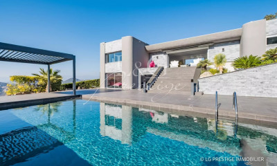 À 10 minutes de Mandelieu, maison jumelée rénovée de 180 m² aux beaux volumes, en pleine nature sur un terrain de 640 m² avec piscine, jacuzzi, cuisine d’été et garage, comprenant un grand séjour, une salle à manger sous véranda, une cuisine indépendante, trois chambres, deux salles de bains, deux WC et un studio indépendant.