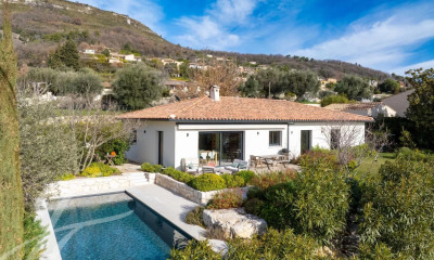 EXCLUSIVITE St Paul Properrties : Bastide construite en 2023, d'une surface de 147m2 habitables érigée sur une parcelle de terrain de 1163m2. A seulement 300m à pied du village Très lumineuse et parfaitement agencée, son exposition plein sud et sud-ouest offre un ensoleillement total et une vue magnifique sur la mer jusqu'au Cap d'Antibes. Elle se compose, de plain-pied, d'une entrée spacieuse, d'une chambre parentale avec salle d'eau et dressing, d'un salon avec toilettes invités, d'une salle à manger avec une grande cuisine ouverte de menuiseries italiennes, donnant sur une terrasse de 48m2. Un cellier, utile et fonctionnel, de style verrière parisienne complète la cuisine. A l'étage, 3 Chambres vue mer et collines, très lumineuses, une salle de bain et un wc suspendu indépendant. Climatisation réversible gainée, double vitrage à galandage, 3 stationnements extérieurs et un garage fermé attenant de 22m2 avec buanderie complètent ce bien. De nombreuses prestations apportent confort et sécurité : Portail électrique, visiophone, porte blindée 5 points avec serrure à empreinte digitale, climatisation, volets et lumière connectés. Un permis accepté et purgé pour une piscine d'une dimension de 4x8m. Assainissement collectif. Une opportunité unique à saisir. Photo avec "projection" piscine implantée sur demande.