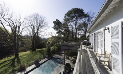 Dans une impasse au calme, en plein centre de Bidart, avec une mode de vie tout à pied, cette jolie maison contemporaine de plain pied de 213m3 a été pensée et décorée avec soin, elle s'articule comme suit : un très bel espace de vie de 65m2 très lumineux, avec cheminée et cuisine ouverte, une belle suite parentale avec dressing et salle de bain complète, deux chambres et une salle de bain, un vaste espace bureau, ainsi qu'un studio indépendant avec chambre et salle d'eau privative. Un espace salle de sport. L'ensemble de la maison est tournée sur les terrasses, le jardin et la piscine. Centre de Bidart et plage à pied.