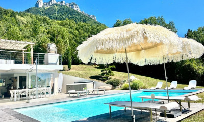 A deux pas du centre village, cette magnifique propriété, au coeur d'un environnement champêtre, a bénéficié d'une superbe rénovation avec des prestations haut de gamme. Particulièrement lumineuse grâce à ses nombreuses ouvertures, celle-ci offre une vue magnifique sur le lac, les montagnes et le Chateau de Menthon Saint Bernard. Cette belle propriété se compose comme suit : • Au rez-de-chaussée, une entrée avec accès à l'ascenseur, un local technique, un studio (ancien garage), une buanderie, un appartement indépendant de 55 m² comprenant une pièce de vie, 2 chambres, une salle de bain et une terrasse • Au 1er étage, une entrée avec rangements, une première suite parentale avec salle de bain + douche et toilettes, un dressing et accès à un balcon avec vue lac, une seconde suite parentale avec salle d'eau et toilettes, une troisième suite parentale avec salle de bain + douche, une quatrième suite parentale avec salle d'eau • Au 2è étage, la pièce de vie avec cuisine ouverte entièrement équipée, une terrasse équipée de spacieux rangements, avec vue panoramique sur le lac et les montagnes, des toilettes séparées, un cellier • A l'extérieur, plusieurs terrasses, dont une avec pergola bioclimatique (et stores verticaux), une piscine chauffée avec volet motorisé, traitée au sel, un pigeonnier transformé en appartement T2 (avec une pièce de vie, une chambre, une salle d'eau avec toilettes), des arbres fruitiers, un local piscine et un local de stockage, un jardin. Prestations tehchniques : • Piscine chauffée par PAC • Chauffage au sol par PAC (PAC indépendante pour le pigeonnier) • Réseaux et électricité neufs + triphasé • Cuisine haut de gamme de marque Vercauteren (tiroirs électriques, four classique, four à vapeur, cave à vins, hotte intégrée) • BSO motorisés • Bras automatisé pour la tv • Portail motorisé • Vélux automatisés • Cheminée à vapeur d'eau • 4 suites parentales • Faïence de marque Diesel • Douches avec ciel de pluie • Chauffe-serviettes haut de gamme • Renforts dans toute la maison • Caméras extérieures • Aspiration centralisée • Piano Smeg et frigo américain dans le studio • Pergola bioclimatique avec stores verticaux