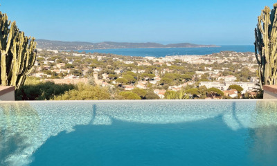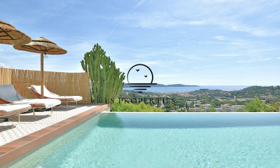 Située dans le domaine résidentiel de l'Eau Blanche, cette villa de charme de 170 m² environ, est implantée sur un terrain de 2 200 m² offrant un cadre paisible et verdoyant. Au rez-de-chaussée, une entrée, un wc invité, un grand séjour-salle à manger avec belle hauteur sous plafond et poutres apparentes, ainsi qu'une cuisine entièrement équipée, le tout ouvert sur de spacieuses et diverses terrasses avec vue mer profitant d'espace repas et détente. Deux belles chambres et une salle de bains complètent ce niveau. Au rez-de-jardin, deux chambres supplémentaires et une salle de douche. Garage avec buanderie et cave complètent ce bien. Très belle villa de charme, avec belle piscine traditionnelle, offrant un extérieur entourée de magnifiques sujets méditerranéens. Prix : 1860000.0 euros, Net vendeur : 1790000.0 euros , Honoraires charge acquéreur : 4.0 %TTC. Bien proposé par Solenne PETRE EI, agent commercial (RSAC 841720436)