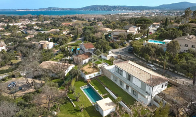 Nouveauté. Au sein d'un domaine très prisé, sécurisé et parfaitement entretenu, cette charmante maison de plain-pied entièrement rénovée propose des prestations de qualité et une décoration soignée sur une surface habitable d'environ 62 m². La pièce de vie, prolongée par une cuisine ouverte, aménagée et équipée, s'ouvre sur une terrasse exposée plein sud, dotée d'un store, qui invite à savourer le climat méditerranéen tout en contemplant le panorama spectaculaire sur la mer et Saint-Tropez. L'espace nuit comprend deux chambres, dont une avec dressing, ainsi qu'une salle d'eau élégante. Édifiée sur une parcelle intimiste et close, la maison dispose d'un jardin privé, parfait pour des moments de détente et de convivialité. Les résidents du domaine bénéficient également de l'accès à une piscine privée. Cette maison, alliant confort et élégance, jouit d'un emplacement exceptionnel et peut être vendue meublée ou non, s'adaptant ainsi à tous types de projets : résidence principale, secondaire ou investissement. Contactez-nous dès aujourd'hui pour obtenir plus d'informations ou organiser une visite privée de ce bien unique dans le Golfe de Saint-Tropez. New. Located within a highly sought-after, secure, and meticulously maintained estate, this charming single-storey house has been fully renovated and offers high-quality finishes and a tasteful decoration across approximately 62 m² of living space. The living area, extended by an open-plan, fully equipped kitchen, opens onto a south-facing terrace with a sunshade, perfect for enjoying the Mediterranean climate while taking in the spectacular views of the sea and Saint-Tropez. The sleeping area comprises two bedrooms, including one with a dressing room, as well as an elegant bathroom. Set on an intimate, enclosed plot, the house features a private garden, ideal for relaxing and entertaining. Residents of the estate also enjoy access to a private swimming pool, adding extra comfort to this rare and refined property. This house, combining comfort and elegance, benefits from an exceptional location and can be sold furnished or unfurnished, making it suitable for all types of projects: primary residence, second home, or investment. Contact us today for more information or to arrange a private visit of this unique property in the Saint-Tropez Gulf. Référence agence : 214