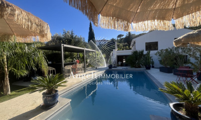 A VENDRE EN EXCLUSIVITE, Villa de style "provençal" avec une très jolie vue mer sur la Baie de Saint-Raphaël. Elle propose de plain-pied un lumineux séjour avec une cheminée, belle hauteur sous plafond "cathédral", une salle à manger, une cuisine contemporaine équipée et aménagée, 2 grandes chambres dont une ouverte sur une véranda prolongée par une agréable terrasse, une salle de bains et une chambre/ou bureau. Ces espaces de vie sont prolongés par de larges terrasses semi-couvertes. A l'étage, deux chambres en suite dont la master avec une vue panoramique sur les collines et la mer, salle de douche et dressing, ainsi que sa terrasse. Un jardin superbement paysagé, organisé autour d'une piscine au sel chauffée. Une cuisine d'été, une cave, un garage et des places de parking extérieures viennent compléter cette propriété La villa peut s'envisager meublée ! UN BEAU COUP DE COEUR