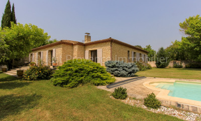 En Provence, dans la ville de Carpentras, une maison bourgeoise entièrement restaurée avec terrasse et studio indépendant. La demeure, datant de la fin du 18e s., est développée sur quelque 300 m² et compte deux étages sur rez-de-chaussée. Son exposition est-ouest lui assure un ensoleillement tout au long de la journée. Sa façade principale, en pierre de taille calcaire, est recouverte d'un enduit de couleur rosée, qui se patine au fil des saisons et prend des reflets variés selon les heures du jour, presque sans modénature. Ses baies sont droites et de formats divers, avec fenêtres à grands carreaux, appuis en pierre moulurée, contrevents en bois peint et, pour certaines, grille ou garde-corps sobre en fer forgé. Depuis l'impasse qui dessert le logis, l'accès au premier niveau se fait par une porte en bois, qui s'ouvre sur une grande entrée. À droite de la porte, se trouvent un petit logement avec son accès indépendant via l'impasse et, à gauche, une porte de garage à arc en anse de panier, encadrée de pierres de taille. Enfin, chacun des trois corps qui composent le bâtiment est surmonté d'un toit à deux pans de tuiles canal, les trois couvertures étant de hauteurs différentes et soulignées par une génoise, à un, deux ou trois rangs. Celles-ci sont percées de plusieurs fenêtres de toit, qui éclairent le dernier niveau, confortablement aménagé sous des poutres apparentes. La maison, entièrement restaurée, a conservé dans son ensemble l'âme d'une demeure citadine de famille sans que ses occupants se soient interdit pour autant des notes de modernité, notamment un jeu de couleurs très actuel, qui singularise les divers espaces. En outre, une grande terrasse carrelée de terre cuite et bordée d'une piscine aux plages en pierre constitue, pour l'habitation, un agrément presque indispensable pour la région. La tranquillité de l'impasse participe d'une atmosphère où il fait bon vivre, épargnant ses habitants de toute nuisance sonore.