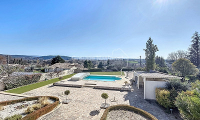 À quelques pas de son village provençal, ce mas authentique offre un cadre idyllique et une vue majestueuse sur le Mont Ventoux. L'âme de la Provence s'exprime à travers la pierre, la lumière et les paysages environnants. Dès l'entrée, vous serez séduits par les volumes généreux et l'atmosphère chaleureuse du rez-de-chaussée. La vaste cuisine, entièrement équipée, s'ouvre sur une cuisine d'été conviviale et ombragée par une pergola, parfaite pour les repas en extérieur. Un cellier et une buanderie viennent compléter cet espace particulièrement fonctionnel. La maison propose également deux salons : une élégante salle à manger prolongée d'un premier salon, puis une deuxième pièce de vie au charme incomparable, dotée d'une cheminée et d'un accès direct au jardin. Deux chambres situées de plain-pied, chacune avec salle d'eau privative, dont une disposant d'un accès direct au jardin, offrent un confort appréciable pour recevoir. À l'étage, quatre suites lumineuses vous accueillent, dont deux avec salles de bains complètes et deux avec salles d'eau, toutes équipées de toilettes et pensées pour allier intimité et confort. Le dernier niveau abrite deux chambres supplémentaires ainsi qu'un bureau, accompagné d'une salle de bains avec toilettes, permettant d'envisager de nombreux usages selon vos besoins. À l'extérieur, le magnifique jardin paysager s'étend vers un splendide espace piscine (12 x 5 m).. Un vaste parking permet d'accueillir environ six véhicules. Cette propriété de caractère, alliant parfaitement charme provençal, élégance et confort, se prête idéalement à une grande maison familiale ou à une activité de chambres d'hôtes. Les informations sur les risques auxquels ce bien est exposé sont disponibles sur le site Géorisques: