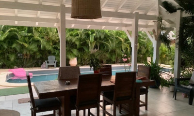Profitez de cette magnifique propriété sur une parcelle totale de 2015 m² comprenant une jolie villa et un terrain viabilisé attenant, proche du centre-ville et des magnifiques plages de Saint-François. Sur une parcelle d’environ 1180 m², cette villa de 155 m² habitables est vendue entièrement meublée. Réalisée par un architecte de renom et décorée avec le plus grand soin, les travaux ont été achevés en 2019. Les assurances décennales sont encore valables jusqu’en 2029. Elle dispose de 4 chambres avec 4 salles de bain attenantes, 2 en rez de jardin et 2 à l'étage. Un large séjour ouvert sur une terrasse d’environ 100 m² offre un grand espace de détente pour profiter pleinement de la piscine de 7m x 4m et de la vue lointaine sur la mer. Le grand jardin paysagé ajoute une touche de sérénité, créant un cadre parfait pour cette résidence de standing. Son atout majeur est sans conteste le terrain à bâtir d’environ 835 m² également inclus dans la propriété offrant un très beau potentiel additionnel. Idéalement située dans un quartier central et hautement résidentiel, cette propriété offre une tranquillité exceptionnelle. Villa équipée d’une citerne d’eau de pluie et d’une citerne tampon. N’hésitez plus, contactez- nous pour de plus amples renseignements.