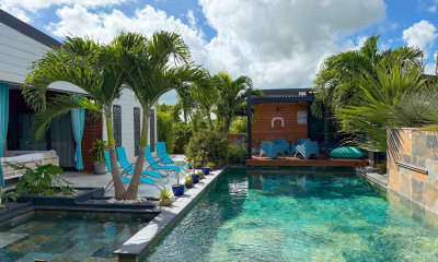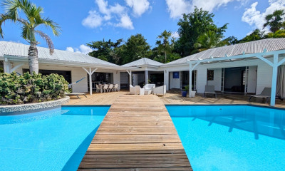 Jolie villa de 128 m² habitables avec piscine et garage sur un grand terrain arboré de 1000 m² dans un lotissement réputé et calme, à 2 minutes du centre-ville de Saint-François. La villa est composée de 3 chambres climatisées, 2 salles d'eau, 1 WC indépendant, une cuisine équipée, un cellier, un séjour climatisé de 31,5 m², une mezzanine de 18 m², une terrasse couverte de 45 m² et un grand garage fermé. La piscine au sel est entourée d'un deck en bois rouge. Le garage peut contenir un véhicule et possède de nombreux rangements. Un carport est également disponible à l'entrée pour protéger une voiture. Le terrain est largement arboré et contient de nombreux arbres fruitiers (bananiers, manguier, cerisier,..). Il est entièrement clôturé avec portail et portillon. Une citerne de 2000 litres vient compléter cette propriété. Le lotissement est calme et proche du centre-ville, des restaurants et du golf.