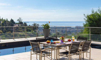 Située sur la colline de Mandelieu, cette villa de style contemporain bénéficie d'une vue panoramique à 270 degrés à couper le souffle sur les îles, la baie de Cannes, le massif de l'Estérel et les Alpes. D'une superficie totale de 260 m², la villa offre plusieurs possibilités d'aménagement et comprend un vaste séjour avec cuisine ouverte, trois chambres, deux salles de bains, une buanderie, un grand garage pour 5 voitures minimum (pouvant se transformer en partie en annexe), un bureau, une salle d'eau avec toilettes. Possibilité de construire 100 m² supplémentaires entre la maison principale et la piscine. En annexe, un beau terrain de 2 561 m², une piscine avec cuisine d'été à l'abri des regards face à la mer.