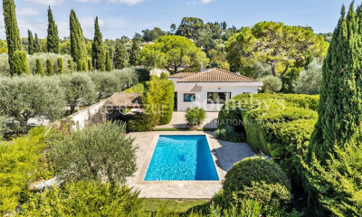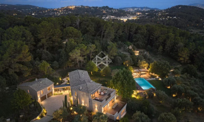 Nichée au calme au cœur d'une impasse confidentielle du prisé quartier de Castellaras, cette charmante propriété provençale en pierre offre une superbe vue panoramique sur les collines s'étendant jusqu'à la mer et au massif de l'Estérel. Cette villa de près de 250m2 dotée de quatre chambres en suite dispose d'une belle suite de maitres et d'un vaste espace de vie chaleureux, prolongé par de généreuses terrasses couvertes, propices aux moments de convivialité à la fraicheur de l'ombre. Son architecture et son environnement en font un véritable havre de paix aux airs de Provence. Exposée plein sud, cette élégante villa prend place sur un terrain de plus de 5 €000 €m² avec une magnifique oliveraie d'une soixantaine de sujets centenaires, offrant un agréable espace avec piscine à débordement chauffée, jacuzzi et un pool-house avec cuisine d'été — un cadre idéal pour des déjeuners estivaux. Pensés pour assurer le confort de ses occupants, les lieux disposent d'une climatisation, d'un chauffage au sol, d'un système audio intégré dans l'espace de vie , et d'un garage. Enfin, sa situation est idéale?puisqu'elle situe à 10 €minutes de l'école internationale Mougins School et du village de Valbonne, ainsi qu'à quelques minutes du vieux village de Mougins. Un système de panneaux solaires complète cette propriété.