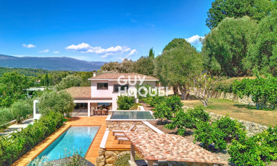 Co-exclusivité. À quelques pas du village, proche des commerces et offrant une vue imprenable sur les collines environnantes jusqu'à la mer, sur un terrain d'environ 1 600 m² joliment arboré. Cette villa récente d'environ 365 €m² est orientée plein sud et se compose au rez-de-chaussée d'une belle réception avec un salon cathédrale et une grande cuisine donnant sur la piscine et le jardin ainsi qu'une belle chambre de maître. À l'étage, trois chambres avec salle de bains ou douche et au rez-de-chaussée un appartement indépendant, un grand garage pouvant accueillir jusqu'à 5 voitures et de nombreux rangements.