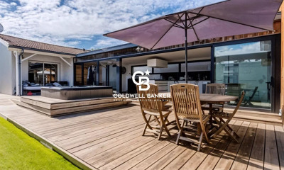 Villa COUP DE COEUR pour cette belle maison d'architecte de plain-pied située au calme dans un environnement recherché côté bassin et non loin de la plage du Mauret. Cette maison d'environ 146 m² habitables a fait l'objet d'une rénovation récente extrêmement qualitative. Vous entrez sur une grande pièce de vie traversante et lumineuse grâce à ses grandes baies vitrées et sa belle cheminée à foyer ouvert vous offrira une douce ambiance pour les soirées plus fraiches. La cuisine et son vaste ilôt central est absolument magnifique et vous donne accès par une baie à galandage vers une grande terrasse bois neuve et très bien exposée sud ouest. Côté nuit, une belle suite parentale ouvre vers une seconde terrasse bois par une baie à galandage, elle dispose d'un espace dressing et d'une jolie salle d'eau privée avec WC. Trois autres chambres sont présentes dans la maison dont 2 avec placard, ainsi qu'une salle de bains et un wc séparé. Au fond du jardin une belle dépendance de 35 m² avec portes vitrées type industrielles vous offre un grand studio avec coin cuisine et une salle d'eau avec wc. Elle abrite également de façon très discrète une grande cave à vin climatisée. Vous profiterez également d'un garage, ainsi qu'un abri pour ranger le bois pour la cheminée. Le jardin est très soigné, et vous apprécierez assurément la belle végétation offrant à cette maison un environnement très nature. (Arrosage par l'eau d'un puits foré). Vous aide vous aimerez vous détendre sur la grande terrasse neuve à l'abri des regards et du soleil grâce à un grand store banne motorisé. La parcelle pourra accueillir une piscine. Vous n'avez plus qu'à vous installer et profiter de cette pépite ! (4.39 % d'honoraires TTC à la charge de l'acquéreur.)