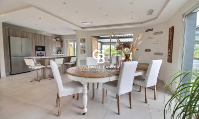 À l'abri des regards dans un quartier pavillonnaire prisé de Gujan-Mestras, cette villa unique en ossature bois déploie 264m² de surface totale de plain-pied. Dans le prolongement d'une grande entrée avec placards, vous découvrirez une vaste pièce de vie jouissant d'une triple exposition avec sa cuisine ouverte haut-de-gamme entièrement aménagée et équipée ainsi qu'un coin détente. Grâce à une baie à galandage de 5m, le salon s'ouvre entièrement sur l'espace piscine exposé plein Sud où s'offrent à vous un couloir de nage exceptionnel de 18m, un solarium, un spa sécurisé ainsi qu'un salon de jardin. Par sa disposition en étoile, accédez depuis la pièce de vie à la suite parentale avec son dressing et salle de bain, à l'opposé vous trouverez une salle de cinéma équipée avec du matériel de qualité. Dans un second espace nuit, quatre chambres, deux salles d'eau et une buanderie complètent les pièces de cette villa d'exception entièrement climatisée. Vous profiterez à l'extérieur d'un superbe jardin paysagé aux multiples essences d'arbres, une immense terrasse en pin où plusieurs coins ont été aménagés pour se relaxer et accueillir vos dîners entre amis ainsi qu'un grand garage de 50m². Cette maison est un véritable havre de paix et de dépaysement! DPE A (58kWh/m²/an) GES A (2kgCO2/m²/an) Estimation des coûts en énergie : 1 070-1 540€/an Prix de vente : 1 475 000€ HAI, les honoraires de 55 000€ sont à la charge de l'acquéreur et représentent 3,87% du prix. Pour obtenir plus de renseignements, contacter Céline HARTENSTEIN Agent Commercial Indépendant N°RSAC 987 559 929 N°RCP 127 100 479 Retrouvez tous nos biens sur IMMOBA Les informations sur les risques auxquels ce bien est exposé sont disponibles sur demande ou sur le site Géorisques :