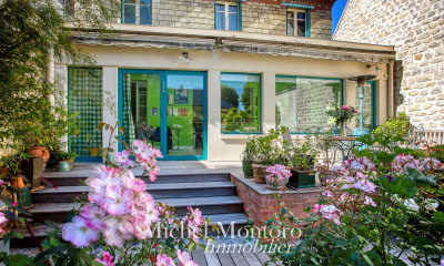 RARE - Dans une des plus jolies rues de Saint-Germain-en-Laye, à cinq minutes à pied du RER A et de la place du marché, maison de caractère de 295 m² sur un joli jardin clos de murs. Rénovée et très bien entretenue, elle offre au rez-de-chaussée : entrée, double réception avec cheminée, espace bureau ou petit salon, jardin d’hiver ouvrant sur terrasse et jardin, cuisine aménagée et équipée, toilettes invités. Au 1er étage un petit salon de 29 m² (ou grande chambre), deux chambres dont une avec jolie terrasse en pierre, une salle de bains, un dressing, une lingerie et toilettes indépendants. Au 2ème étage un palier dessert cinq chambres et une salle de bains. Bâtisse en très bon état, la toiture est en cours de rénovation. Un box fermé, une cave et un grenier. En annexe au rez-de-chaussée une chaufferie et un local technique pouvant également accueillir les vélos.