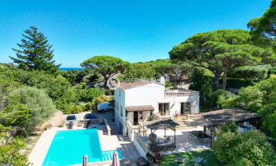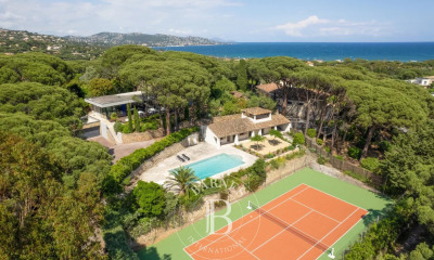 À deux pas de la mer, cette maison d'architecte dissimulée dans la verdure réinvente le luxe discret. Située dans un domaine privé, cette villa d'exception s'intègre avec naturel à son environnement méditerranéen. Entourée de palmiers et de lumière, elle s'étend sur 394 m² et développe six chambres pensées comme des refuges, ouvertes sur un jardin soigneusement paysagé de 1550 m². La vie se déroule entre intérieur et extérieur, dans une continuité fluide et apaisante. Le séjour prolonge son ambiance vers une grande terrasse couverte et ombragée, véritable salle à manger d'été, propice aux déjeuners en famille ou entre amis. Non loin, la piscine aux lignes épurées s'inscrit dans le décor végétal, accompagnée d'une cuisine d'été qui invite à prolonger les journées sous le ciel de la Côte d'Azur. Un espace bien-être, avec sauna, complète l'expérience sensorielle du lieu. Le garage, parfaitement intégré, ajoute une touche de fonctionnalité à cette maison où chaque détail a été pensé avec justesse et discrétion. Un lieu hors du temps, où la lumière, la mer et les essences méditerranéennes composent un art de vivre apaisé. Cette villa incarne une certaine idée du luxe : intime, élégant, profondément lié à l'âme du Golfe de Saint-Tropez.