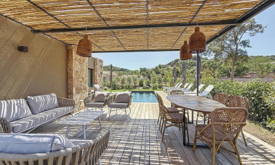 RV2007 – Domaine de Marina di Fiori – Porto-Vecchio Située au cœur du recherché domaine privé de Marina di Fiori, cette villa bénéficie d’un environnement paisible et verdoyant, à proximité immédiate des plages et du centre de Porto-Vecchio. De plain-pied, elle développe environ 215 m² et offre une vaste pièce de vie traversante, baignée de lumière et ouverte sur l’extérieur. La cuisine aménagée et équipée est complétée par une arrière-cuisine et une buanderie. L’espace nuit accueille 4 chambres, chacune avec sa propre salle d’eau. Implantée sur un terrain paysager d’environ 2 100 m², sans vis-à-vis, la propriété profite d’une vue dégagée sur la nature. Une piscine et un garage complètent les extérieurs. Le domaine de Marina di Fiori propose des installations variées, accessibles sous conditions, offrant un cadre de vie privilégié. Honoraires à la charge du vendeur