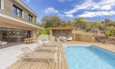 À 10 minutes de Porto Vecchio et de Pinarello, maison d'architecte d'environ 330 m2. Galerie d'entrée donnant sur salon, salle a manger, cuisine américaine entièrement équipée. 6 suites avec dressing et salles de bains. Plusieurs terrasses, et très beau terrain arboré, vue mer. À 5 minutes à pieds de la plage.