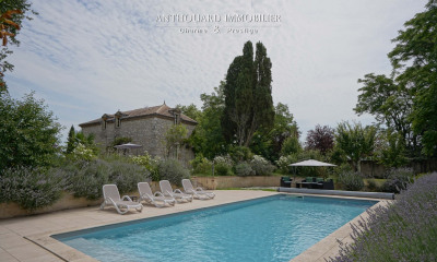 Sud Bergerac, propriété de charme au centre de son parc bucolique de 1,7ha, piscine et gîte Proche Villeréal et à moins de 30 minutes de Bergerac. Ensemble en pierre composé d’une maison 3/4 chambres, d’une maison d’amis trois chambres et d’un pigeonnier avec deux chambres d’hôtes. Piscine creusée, sauna, espace cuisine d’été. Ensemble de charme offrant 388 m² habitables sur un parc paysagé de 1.7 hectare, sans nuisance et proche des commodités Maison principale pour 224 m² habitables RDC Espace entrée sur salle à manger. Salon séparé. Cuisine équipée neuve avec accès sur terrasse couverte. Une chambre avec suite salle de bains et douche, wc indépendants. Une seconde chambre avec salle d’eau et wc attenants. Espace lingerie et cave à vin. Étage depuis salon Chambre 3 avec suite salle d’eau et wc. Étage depuis salle à manger Bureau ou chambre d’amis. Dressing. Maison d’amis pour 130 m² habitables RDC Séjour avec cuisine ouverte, cheminée en pierre, ancien évier en pierre. Cellier. Chambre 1 avec suite salle d’eau et wc. Étage Chambre 2 avec salle d’eau et wc. Chambre 3 avec suite salle d’eau et wc. Le Pigeonnier Sur trois niveaux. Une première chambre en rez-de-chaussée, salle d’eau et wc au premier étage, puis une seconde chambre au deuxième étage. Bel environnement, vue sur un parc arboré depuis les maisons et vue dégagée sur la campagne depuis la cuisine d’été et la piscine.