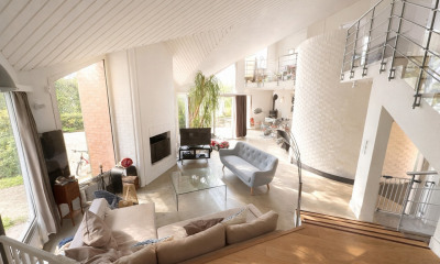 - au rdc : une entrée ouverte sur un séjour/salon traversant d'environ 43 m2 avec cheminée, une véranda d'environ 19 m2, une cuisine contemporaine aménagée et équipée avec arrière cuisine, des toilettes indépendantes avec lave-mains, un garage pouvant contenir 2 véhicules.