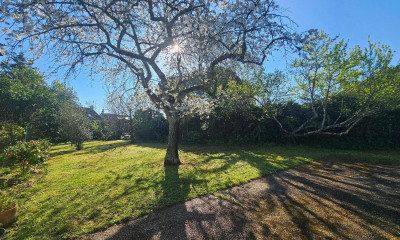 Dès l'entrée, le ton est donné : une entrée avec placard vous accueille et dessert un séjour/salle à manger avec cuisine américaine aménagée et équipée d'environ 40,65 m². La pièce de vie avec ses 2.65 m de hauteur sous plafond, bénéficie de deux baies vitrées ouvrant directement sur la terrasse et le jardin, inondant l'espace d'une belle lumière naturelle. Le sol en parquet traditionnel bâton rompu en bois apporte chaleur et caractère à l'ensemble de la maison.