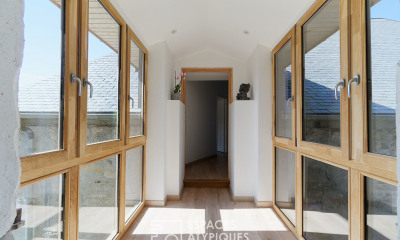 Un escalier en ferronnerie d'art mène au premier étage, où se trouvent trois chambres spacieuses et une salle de bain. La continuité de cet escalier permet d'accéder au deuxième étage, dédié à la détente avec un salon télé et une jolie chambre avec salle d'eau et wc, le tout offrant un plafond majestueux, de poutres apparentes.