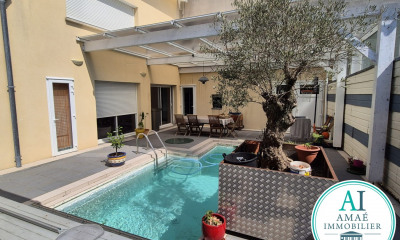- Un logement principal T5 de 185 m², idéal pour une famille, comprenant au rez-de-chaussée une entrée, un vaste séjour lumineux avec cheminée et cuisine américaine (85 m² au total), une chaufferie, une chambre avec salle d'eau équipée d'une baignoire balnéo et d'un hammam. À l'étage, un palier dessert trois chambres, une salle d'eau et un WC. Côté extérieur, un agréable patio privatif avec piscine et terrasse, un authentique puits en pierre sécurisé, complètent cet espace de vie et quatre garages.