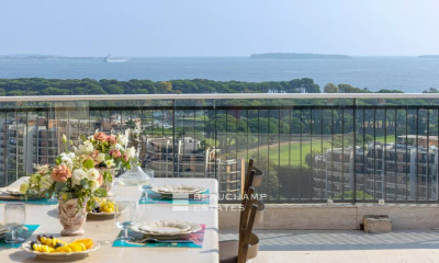À l'étage, 4 chambres, chacune disposant d'une salle de bain, de grands placards et ouvrant sur une seconde terrasse avec transats face à la baie de Cannes.