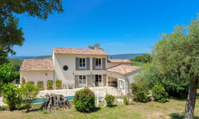 Cet espace 'lounge' est idéal pour vous détendre au coin du feu. Dans la continuité, le séjour/cuisine US donnent sur la terrasse en IPE pour vos déjeuners en été, ou vous pourrez profiter du 'tableau' provençal qui s'offre à vous : campagne, Ste Baume, mer au loin. Le coucher de soleil est exceptionnel !