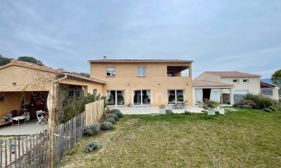 L’espace principal, aujourd’hui exploité sur une surface d’environ 180 m², constitue le cœur de la maison. Il comprend la partie haute, d’environ 120 m², ainsi qu’un niveau inférieur intégrant deux grandes chambres, offrant un ensemble harmonieux et fonctionnel. La pièce de vie séduit par son atmosphère lumineuse et chaleureuse : la cuisine équipée et l’espace repas prennent place sous une verrière d’époque, largement ouverte sur le jardin et offrant une belle perspective sur les paysages du Luberon. Un lieu de vie pensé pour conjuguer confort, élégance et art de vivre.