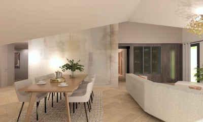 - Au 2e étage, une mezzanine/coin détente, un couloir suspendu au-dessus de la pièce de vie, trois chambres, des toilettes séparées, une salle de bain