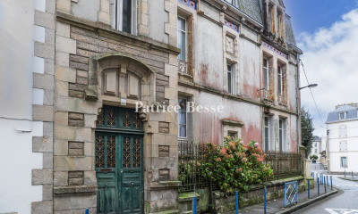 En Bretagne, à Guingamp, une maison bourgeoise du 19e s.. La propriété est située dans un quartier résidentiel où se dressent des demeures cossues et remarquables sur le plan architectural. Un mur, percé de deux portails à double vantaux couleur vert bouteille, place la maison à l'écart de la rue et dissimule une cour gravillonnée sur laquelle il est possible de stationner plusieurs véhicules. Le premier portail est large et motorisé ; le second, en fer forgé en partie ajouré, arbore un style classique avec des volutes et une pointe de lance à son sommet. Il repose sur deux piliers composés de briques et de granit, surmontés d'un chapeau à double couronnement. À l'est, un large passage de 3,5 m longe le pignon et conduit vers un parc fleuri et arboré à l'arrière, qui s'étend sur près de 1 200 m². Plusieurs dépendances entourent cette demeure de haute stature : un garage couvert est implanté à l'avant, dans la cour, et un second bâtiment, situé à l'arrière, sert actuellement de lieu de stockage. L'ensemble de la parcelle est constructible. Le jardin est clos de murs anciens. Elle présente un plan carré, mitoyen, avec un corps de bâtiment saillant sur le flanc sud. La toiture est un toit à la Mansart, composé d'un terrasson et d'un brisis en ardoises naturelles. Des lucarnes, tantôt à chevalet, tantôt retroussées, mettent en valeur la façade avant, composée de pierres de taille aux encadrements de baies, de briques et ponctuée de bandeaux horizontaux en saillie. Au premier niveau, les baies s'ornent de garde-corps en fer forgé peint en noir. Une frise de faïence florale aux tons de bleu est visible sous chaque appui de fenêtre de la façade avant. Au pignon est, les fenêtres sont protégées par des grilles de défense. La façade arrière, plus sobre, est en moellons de granit et comporte de nombreuses ouvertures. Une porte-fenêtre s'ouvre en particulier sur un escalier en pierre, menant au jardin, légèrement en contrebas. Une marquise protège le perron. La porte d'entrée principale, en bois peint blanc, propose un style semi-plein : partie basse pleine, partie haute vitrée grillagée d'une grille en ferronnerie, elle est surmontée d'une imposte vitrée composée de trois grands carreaux. Quelques buis, des plantes buissonnières aux feuillages variés et quelques fleurs encadrent l'entrée.