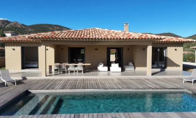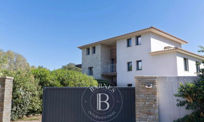 Implantée sur une parcelle d’environ 2 500 m², la villa est entourée d’un jardin méditerranéen aux allures de maquis : pins maritimes, oliviers, genévriers, immortelles ou encore arbousiers rythment les espaces et diffusent leurs parfums, pour une ambiance apaisante et typiquement insulaire.