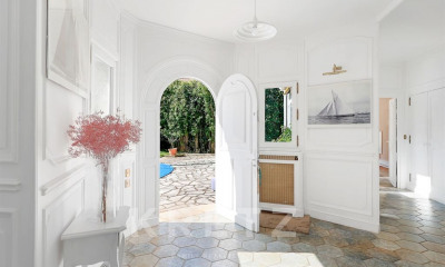 Dès l'entrée, les rangements intégrés traduisent le soin apporté aux détails. Dans le prolongement, une perspective sur la piscine intérieure, visible derrière une paroi vitrée, installe immédiatement une atmosphère unique.