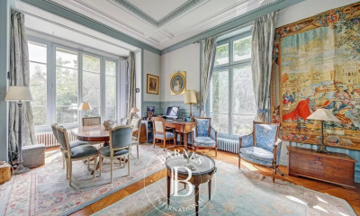 5. Double séjour lumineux de 47 m2 avec 6 grandes fenêtres en bois double vitrage, un parquet ''pointe de Hongrie'', une belle hauteur de plafond.