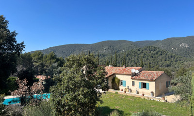 À l'extérieur, les espaces ont été pensés pour profiter pleinement du cadre. Une piscine de 11 x 5 mètres s'intègre parfaitement dans le paysage, accompagnée de son pool house, idéal pour les journées d'été. Les terrasses offrent différents espaces de vie, entre détente et convivialité, toujours avec en toile de fond ce panorama ouvert sur Ansouis.