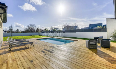 une piscine chauffée, à l'abri des regards, avec pool house et terrasses en bois exotique, invitant à la détente et à la convivialité.