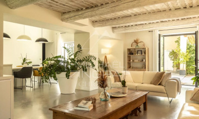 Le mas principal, entouré d'arbres matures et de jardins paysagers, profite d'une tranquillité totale. Conçu pour une vie élégante mais détendue, il offre au rez-de-chaussée un vaste salon avec cheminée en pierre de taille, murs en pierre apparente et poutres anciennes, une grande salle à manger avec les mêmes éléments de caractère, un second espace repas avec de larges portes cintrées donnant sur la terrasse, ainsi qu'une cuisine spacieuse équipée d'un piano Lacanche, ouverte sur la piscine grâce à de belles verrières en fer forgé. Deux chambres doubles se trouvent également à ce niveau : l'une avec salle de bain attenante et accès direct à la piscine, l'autre avec salle d'eau. Une buanderie, une pièce de rangement ou cave, une salle de sport et des toilettes invités complètent ce niveau.
