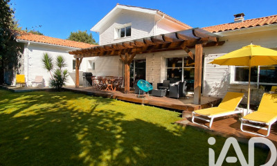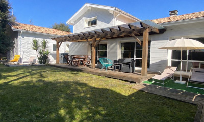 Maison de plage d'architecte contemporaine, belle pièce de vie lumineuse, cuisine ouverte, buanderie, 3 chambres, 1 salle de bains,1 salle d'eau, , terrasse et jardin, double garage, situation en impasse au calme, plage et dune accessibles à pied, secteur recherché de Labenne Océan