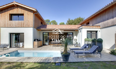 iad France - Cécile Bazerque vous propose: OEYRELUY à 10 minutes de DAX - Maison T6 contemporaine de plain-pied à ossature bois d'environ 168 m² avec piscine chauffée, panneaux solaires, atelier, abri bois, carport et parking. Excellent DPE C / A