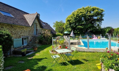 À 10 minute de Quimperlé, à l'entrée d'Arzano, se dévoile un ensemble immobilier rare, pensé pour accueillir, recevoir et faire vivre des moments d'exception.Implantée sur 2 700 m2 de terrain clos, cette propriété en pierre conjugue avec élégance une longère de caractère et une maison de maître de 1921, formant un ensemble harmonieux de 357 m2 habitables, aujourd'hui exploité en chambres d'hôtes.Dès l'entrée, les volumes impressionnent. La maison principale développe 207 m2habitable, avec une pièce de vie chaleureuse d'environ 60 m2, réunissant salon et salle à manger autour d'un insert et d'un poêle, créant une atmosphère conviviale et authentique. La cuisine fonctionnelle, aménagée et équipée, s'organise autour d'un îlot central, avec des plans de travail en granit, pensée aussi bien pour la vie quotidienne que pour recevoir.Les étages accueillent des espaces nuit confortables, dont au second et dernier niveau une suite parentale volumineuse et baignée de lumière, offrant un confort optimal et une véritable intimité.La longère en pierre complète l'ensemble et permet une exploitation immédiate en chambres d'hôtes, tout en conservant une parfaite cohérence architecturale et fonctionnelle avec la maison principale. L'agencement actuel permet d'accueillir famille, amis ou voyageurs dans des conditions idéales, sans jamais empiéter sur la vie privée.À l'extérieur, le jardin clos assure sécurité et sérénité, notamment pour les plus jeunes, et s'ouvre sur une piscine sécurisée, véritable invitation à la détente aux beaux jours.Une propriété rare, à la fois résidence familiale de caractère et outil de réception ou d'activité touristique existante, située dans un environnement calme tout en restant à proximité immédiate de Quimperlé et de ses commodités.Un lieu de vie, de partage et de projet.