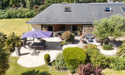 À l'extérieur, plusieurs terrasses abritées s'intègrent harmonieusement au jardin paysager. Un olivier tricentenaire apporte une touche méditerranéenne rare en Bretagne. La parcelle arborée d'environ 4 000 m², constructible, se compose de pelouses, haies et massifs exotiques, créant un cadre intime et soigné. Cet espace modulable se prête aussi bien aux repas d'été qu'à un projet de piscine ou de potager. Vue du ciel, la propriété révèle un aménagement harmonieux et minutieusement pensé.