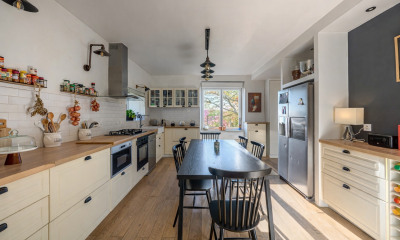 L'entrée distribue deux univers : À gauche, un premier salon-bibliothèque accueille . À droite, la cuisine occupe une place centrale dans la maison. Pensée dans un esprit campagne aux lignes sobres et aux teintes claires, elle offre une vue inspirante sur la rivière. Chaque matin, les reflets du soleil sur l'eau apportent une superbe lumière.