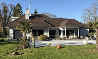 A l'étage, un grand pallier dessert une grande chambre avec placards, sa salle de bains-douches avec toilettes, un bureau avec de nombreux rangements, 3 chambres se partageant une salle de douches, toilettes séparées. Le jardin, arboré et fleuri, présente une jolie terrasse orientée Sud, un jacuzzi et un kiosque charmant.