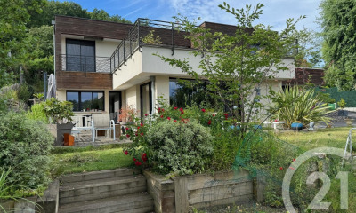 Édifiée sur un vaste terrain arboré de 2 850 m², la propriété se distingue par son architecture singulière : une toiture graphique aux multiples arêtes, des volumes généreux et une circulation intérieure baignée de lumière. D'une surface habitable de 230 m², elle comprend un studio indépendant de 36 m².