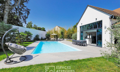 Pensée pour conjuguer volumes, lumière et confort haut de gamme, elle dispose de cinq suites, d'une piscine chauffée au sel, d'un jacuzzi, d'un garage de 50m² avec borne électrique à charge rapide, et d'une vue dégagée sur la campagne.
