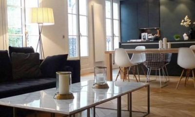 Le deuxième étage est occupé par une suite parentale en dernier niveau. Elle offre un espace généreux avec coin salon, lit king size, vue dégagée sur Paris, dressing, salle de bains avec baignoire balnéo, douche séparée et WC indépendant.