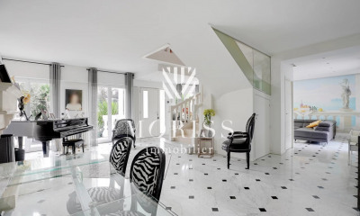 Dès l'entrée, l'atmosphère est saisissante : sols en grès poli, teintes poudrées, atmosphère haut de gamme et lumière omniprésente révèlent un intérieur traité avec exigence. Le vaste espace de vie, traversant et baigné de lumière, joue sur la transparence et les reflets. Il accueille un salon cosy face à un mur avec écran intégré, une salle à manger conviviale et une cuisine contemporaine ouverte, aux lignes minimalistes et parfaitement équipée. L'ensemble communique harmonieusement avec le jardin sans vis-à-vis, offrant un prolongement naturel et intime lors des beaux jours.