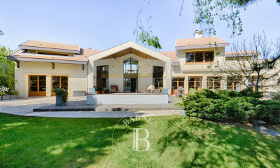 À l'extérieur, la terrasse prolonge naturellement les espaces de réception et s'inscrit dans la continuité du jardin exposé plein sud. L'ensemble forme un cadre végétal intime, offrant différentes possibilités d'aménagement, y compris l'implantation d'une piscine selon les envies.
