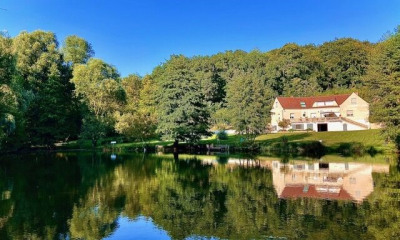 La maison fait face à un bel étang arboré et très poissonneux, encadré de 2 bois et d'une belle surface de prairie.