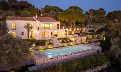 Clarté exceptionnelle et adresse prestigieuse caractérisent cette vaste demeure nichée à flanc de colline, sans aucun vis-à-vis, à la décoration raffinée et haut de gamme. Profitez d'une vue panoramique spectaculaire sur la Méditerranée et le massif de l'Estérel, tout en résidant à seulement 15 minutes à pied des commodités et à proximité immédiate de Cannes.